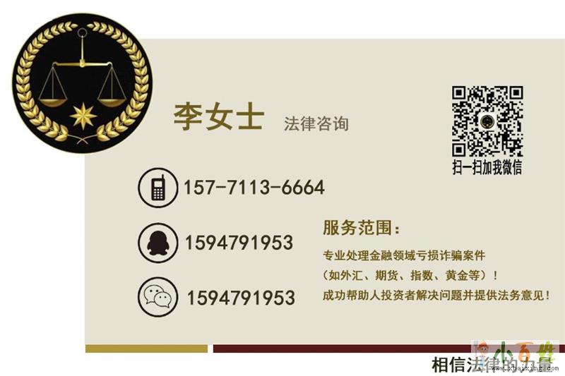 我们是法律咨询团队经验丰富,有多种渠道进行技术亏损挽回,四加一模式成功率高,华信大宗商品已经有成功案例,尽快处理,时效性会更高,成功机率就越大!外汇、指数诈骗案子层出不穷,违法途径暗箱操作。依据我国法令法规,在不合规不合法途径操作被骗的资金,都是可经过正当的亏损挽回追回资金的,经验丰富的咨询团队,法律咨询亏损挽回能以最快的速度挽救亏损资金!不论你是在股票、现货、邮币卡、大宗产品、外汇等亏损或不让出金均可联系法律咨询李女士!